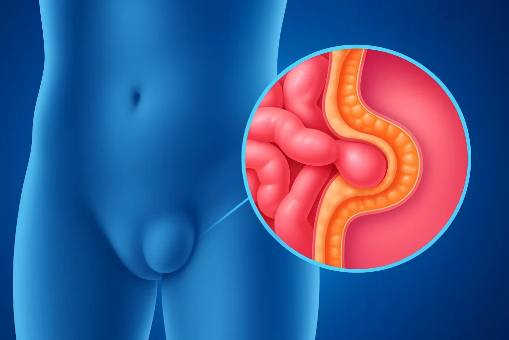 Una hernia inguinal ocurre cuando una parte del intestino sobresale a través de una zona débil de la pared abdominal, generalmente en la ingle. Es una de las hernias más frecuentes en adultos.